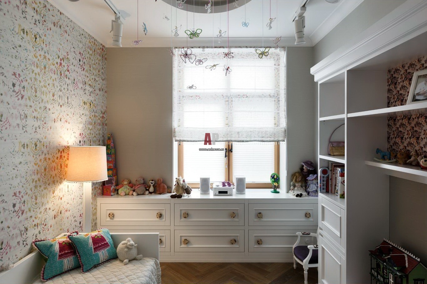 Детская комната для девочки со светлой мебелью и обоями с тканным орнаментом.