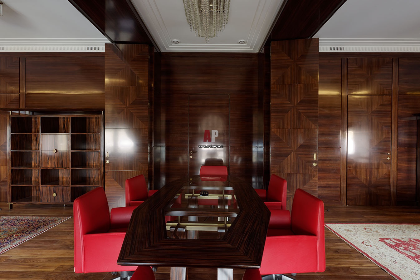 Интерьер зоны переговорной при полностью раскрытых симметричных дверях. Массивная половая доска из древесины американского ореха.