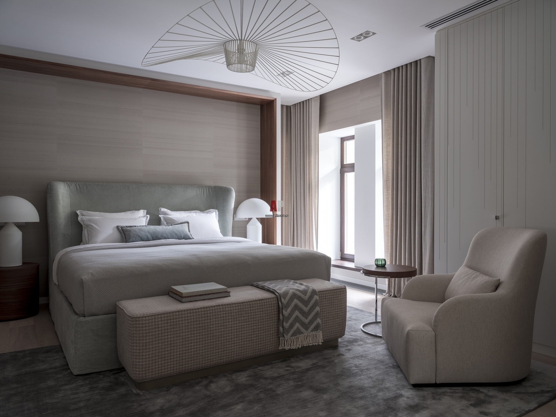 Спальня на втором этаже. Кровать, Meridiani. Обрамление портала выполнено из американского ореха. Лампы и торшер, Oluce.