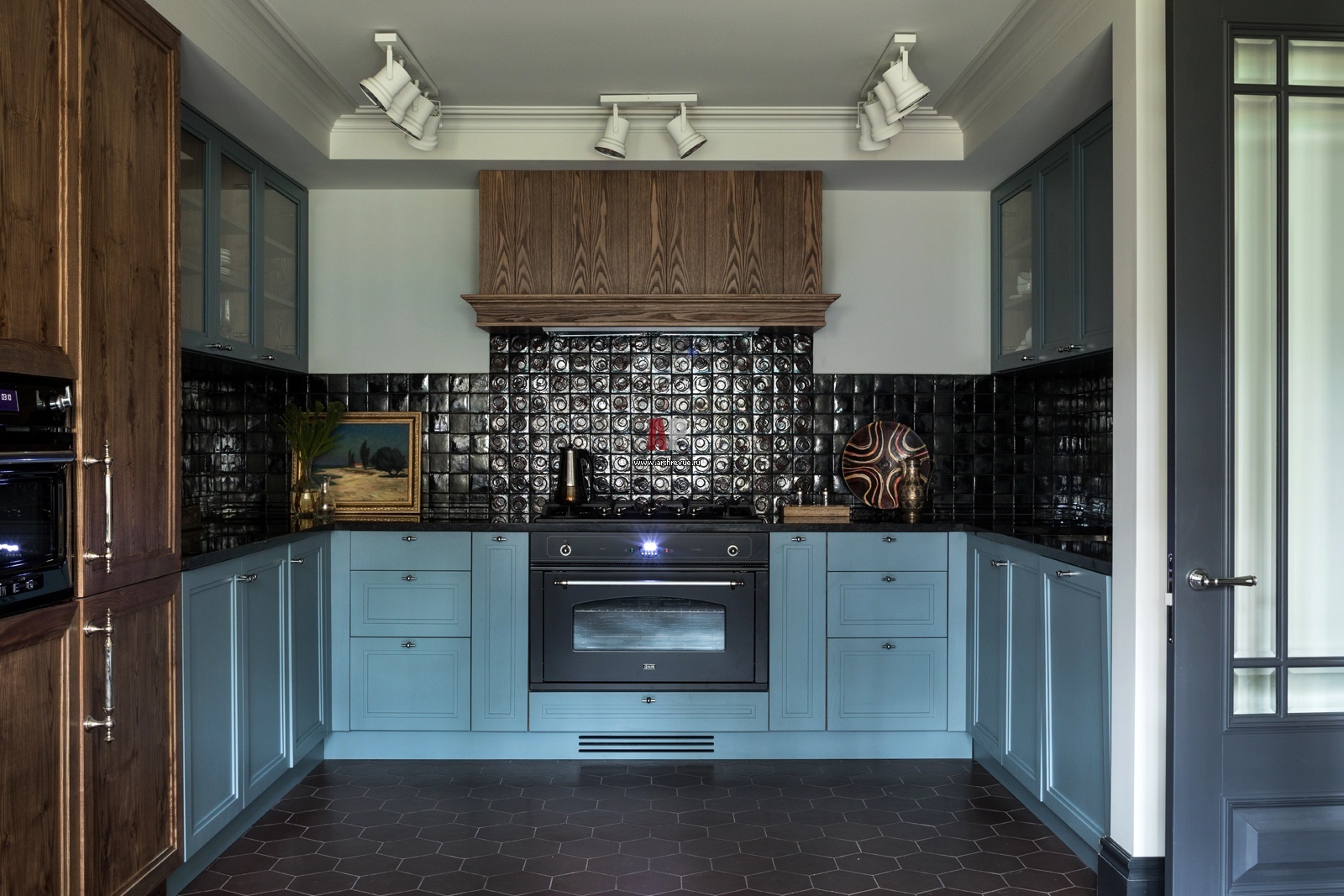 Заказчик хотел изразцовый камин, но технически сделать его было невозможно. Поэтому дизайнер предложила оформить изразцами кухонный фартук. Он выполнены в сложном зеленом, почти черном цвете. Кухня сделана на заказ в столярной мастерской.