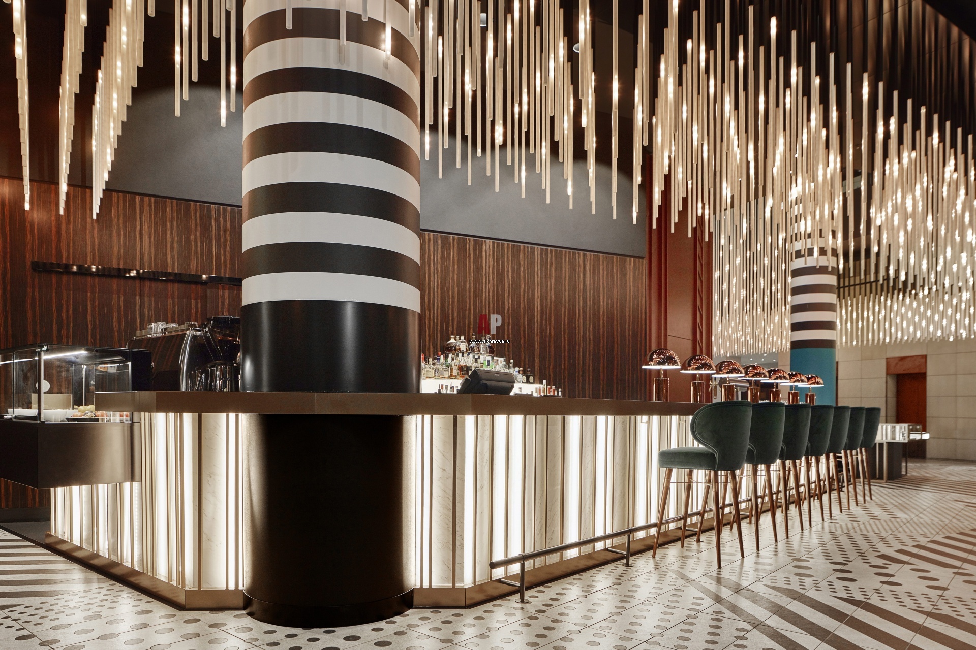 Барная стойка сложной геометрической формы зонирует открытое пространство лобби отеля. Фасад и столешница бара сделаны из оникса и мрамора сорта Volakas с подсветкой.