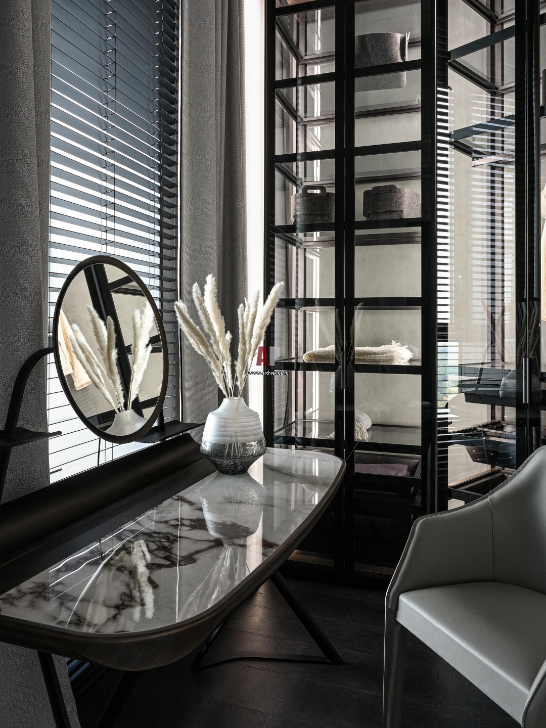 Монохромная квартира в стиле лофт-минимализм. Интерьер гардеробной при спальне. Туалетный столик с мраморной столешницей, Cattelan Italia.