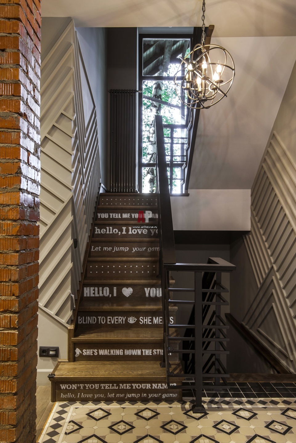 Брутальная лестница с коваными перилами и деревянными подступенками, украшенными позитивными надписями.