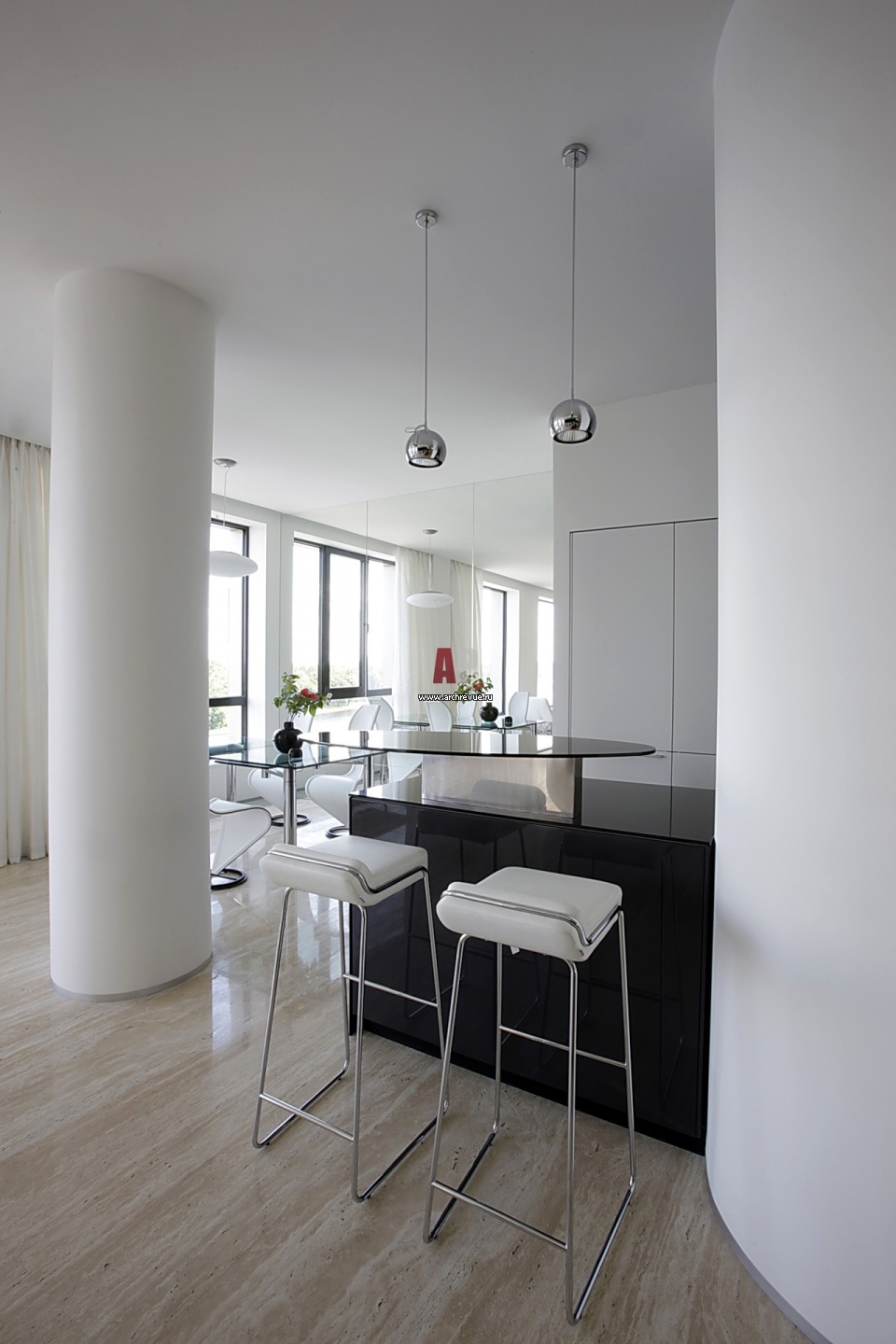Массивные несущие колоны были скруглены. Между ними – барная стойка из черно лака с овальной стеклянной поверхностью. На дальнем плане – обеденный стол из стекла.