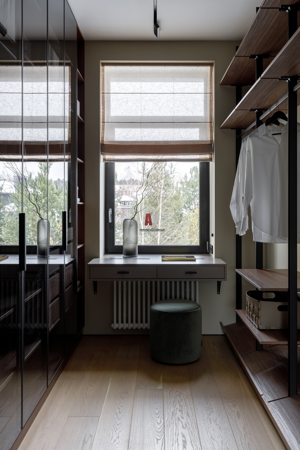 Гардеробная состоит из двух частей: мужского и женского гардероба. Между ними у окна расположен консольный туалетный столик.
