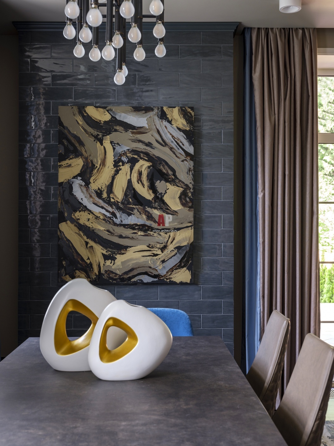 В отделанном глазурованной керамикой ризалите за абстрактной картиной спрятан ТВ-экран и система домашнего кинотеатра.
