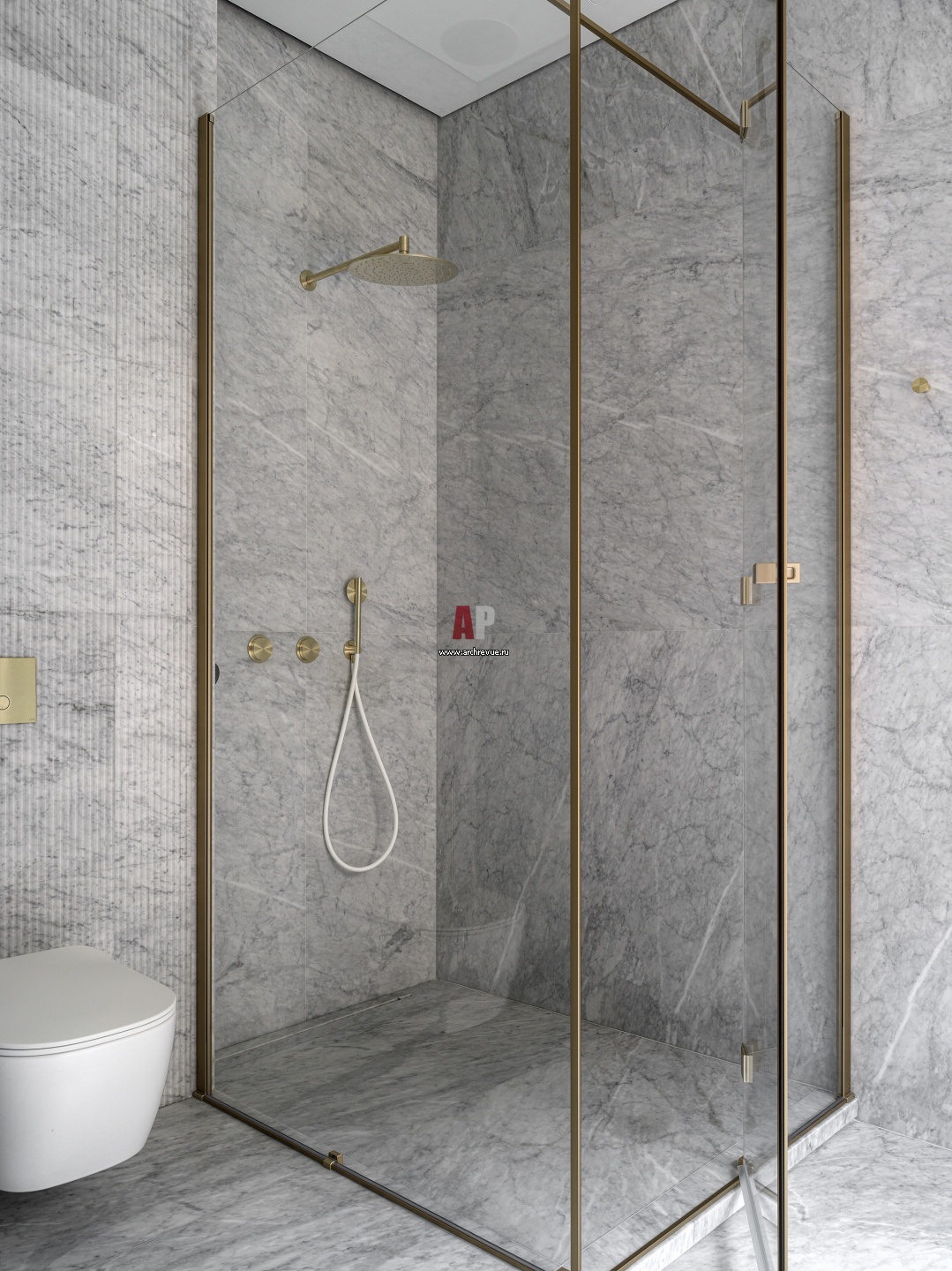 Современная квартира для семьи. Мастер-ванная. Унитаз, Antonio Lupi. Душевое ограждение, Vismara, Vetro.