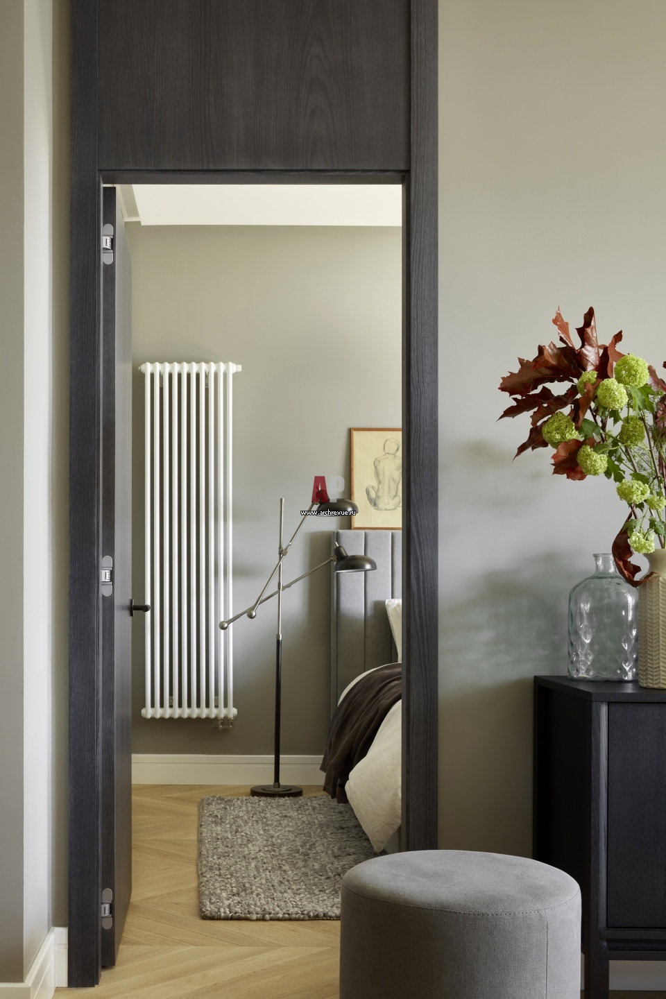 Коридоров в квартире нет. Дверь из гостиной ведет в спальню. В квартире уже были возведены стандартные дверные проемы высотой 2,1 м. Дизайнер решила их визуально скорректировать с помощью наличников от пола до потока и шпонированной верхней фрамуги. Дверные ручки, Buster + Punch, поставщик EMPORIO.ru.