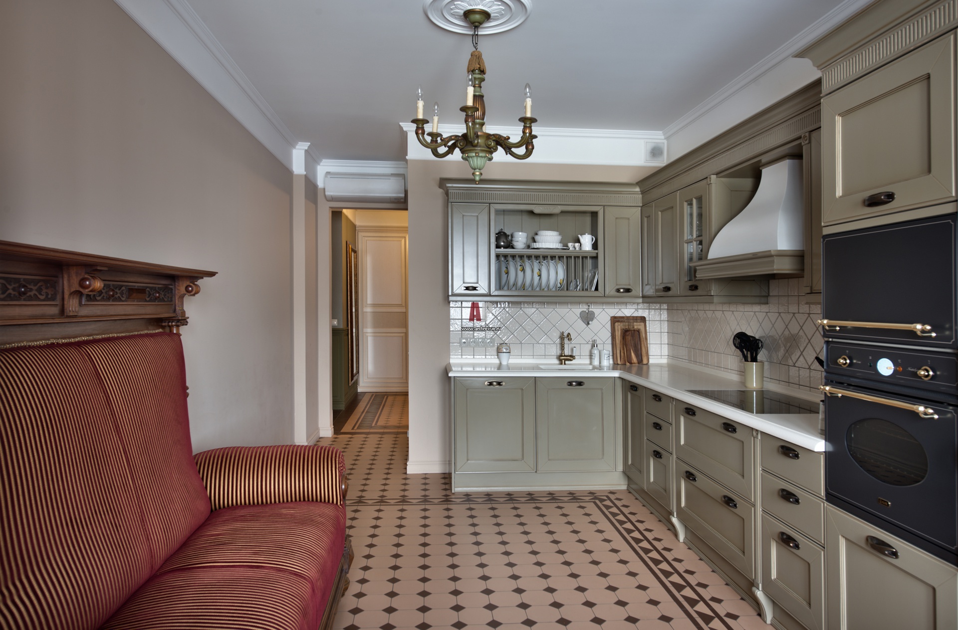 На фото – английский стиль в оформлении кухни. Кухонный гарнитур выполнен в светлом, пыльно-зеленом цвете. Керамическое панно на полу в бордовой гамме. Английская керамическая плитка, поставщик «Биг Бен» (подразделение «Интерьерный салон»).