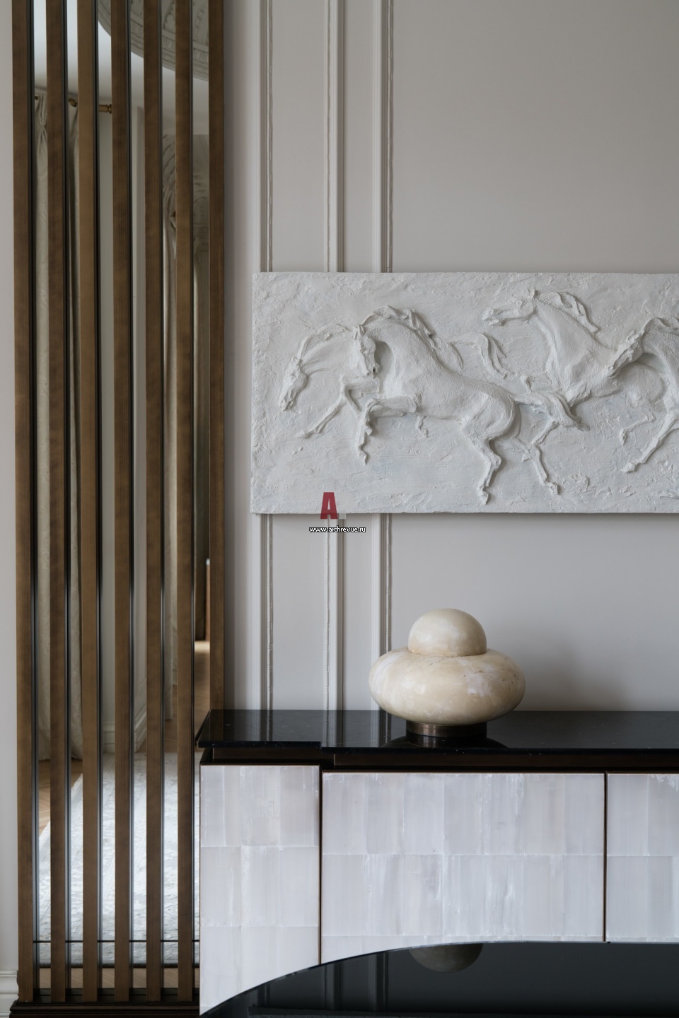 Фрагмент столовой. Комод изготовлен на заказ по эскизам дизайнера. Настенное гипсовое панно, винтаж. Настольные лампы из камня, винтаж, 1950-х гг., Франция.