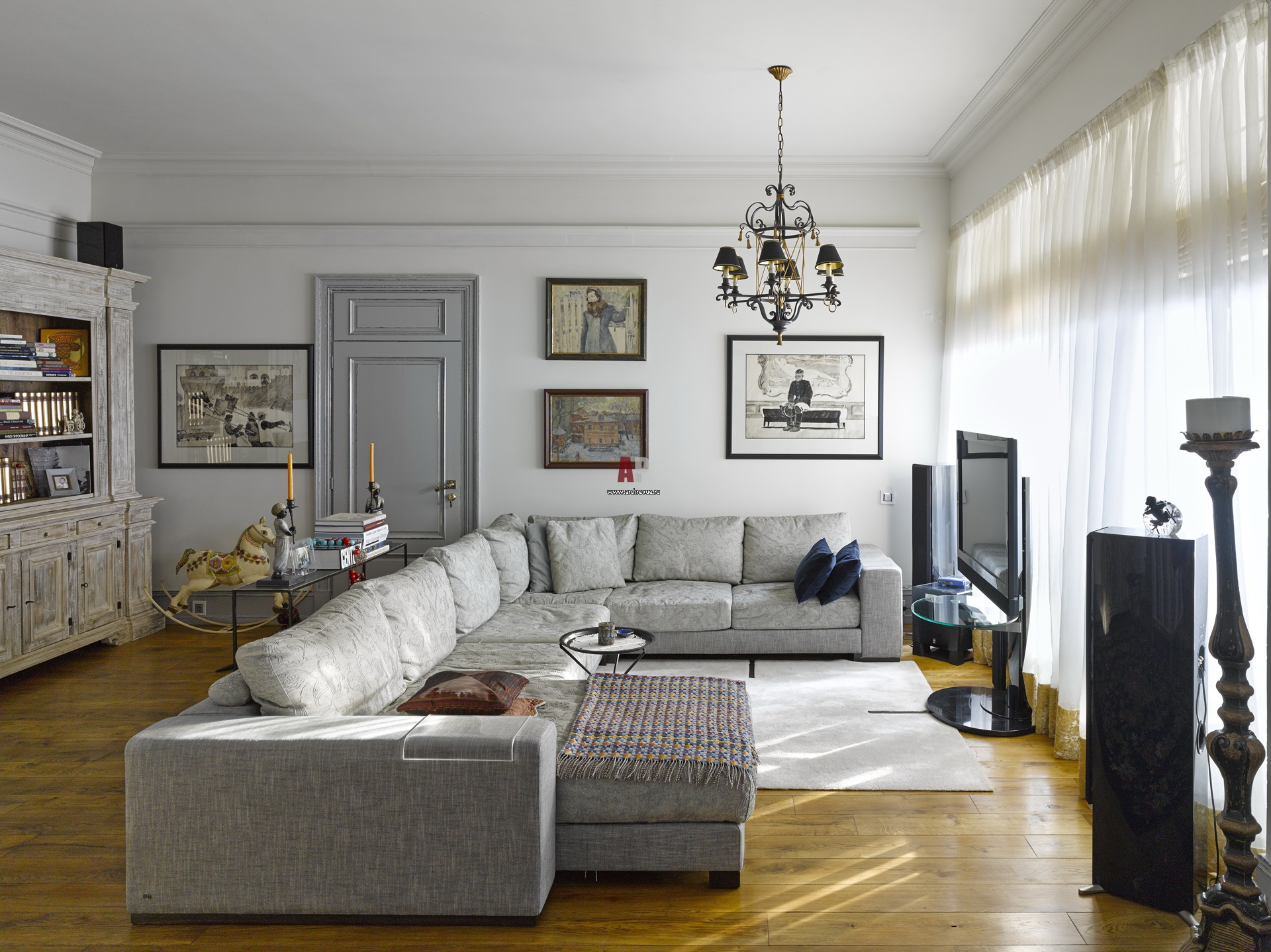 Интерьер гостиной решен в нейтральной цветовой гамме. Однотонные покраски служат фоном для ярких аксессуаров и произведений искусства. Лепной карниз, Orac Decor, поставщик «Ампир Декор».