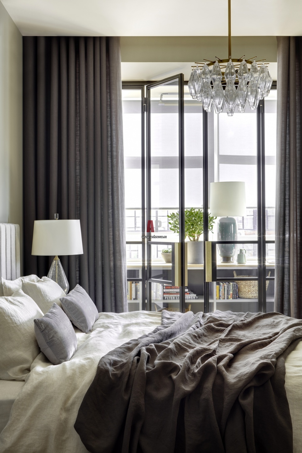 Основное преимущество квартиры – большая лоджия вдоль всей фасадной стены, на которую можно попасть как из гостиной, так и из спальни. Между лоджией и спальней установлены стеклянные перегородки из черного металла с фурнитурой из латуни. Настольная лампа, Uttermost, стеклянное основание в отделке из хрусталя, абажур – текстиль.
