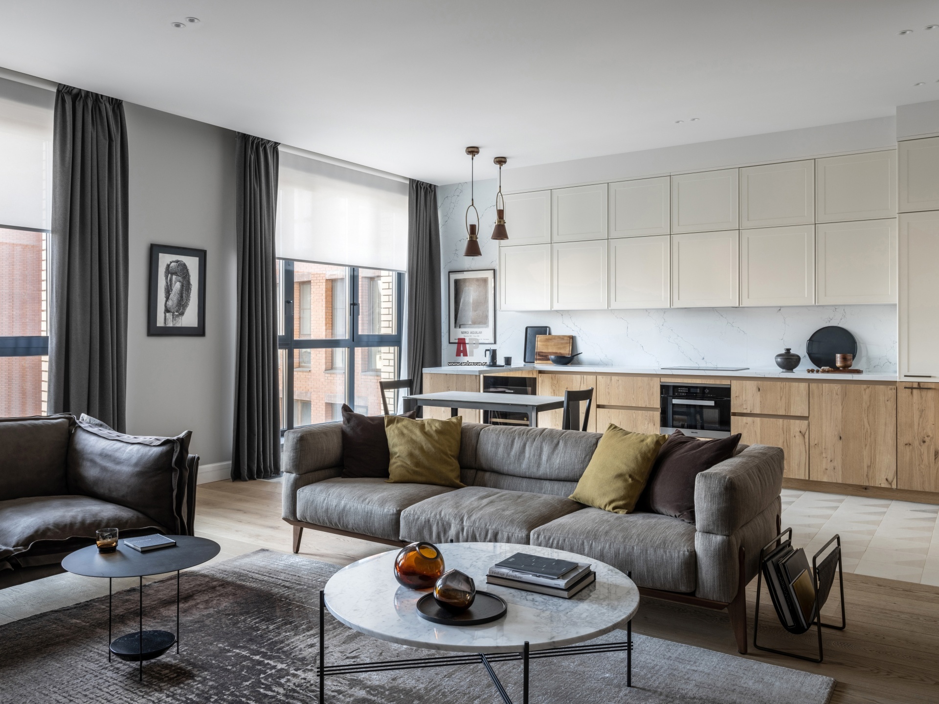 Примерно треть всей площади квартиры занимает общественная зона. Гостиная и кухня выделены разными материалами отделки пола – дубовой доской разной ширины Ebony and Co (гостиная) и плитка Mutina (кухня-столовая).