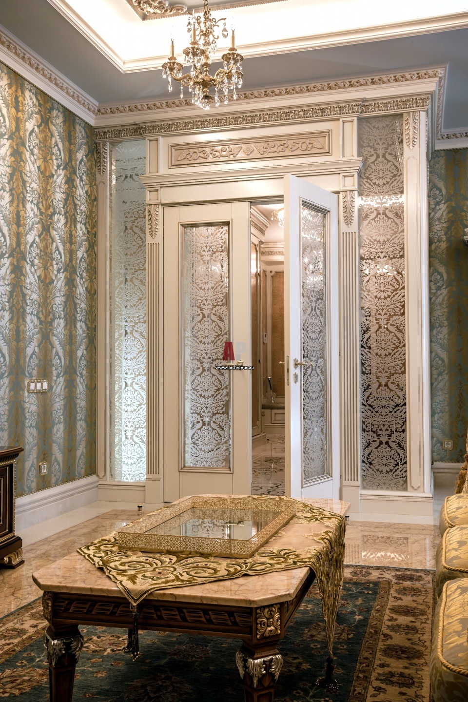 Хрустальный портал в представительской гостиной. Стеклянные двери с цветочной гравировкой обрамлены деревянным порталом цвета слоновой кости с патиной.