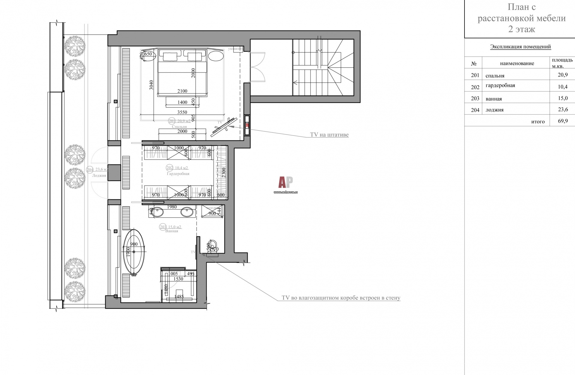 План второго этажа трехэтажного пентхауса с верандой на крыше. Общая площадь – 300 кв. м.