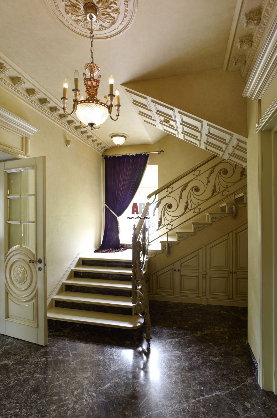 Парадная лестница с изящным кованым ограждением. Потолок украшен лепным декором из гипса. Под лестницей – встроенные шкафы, скрытые за буазери.