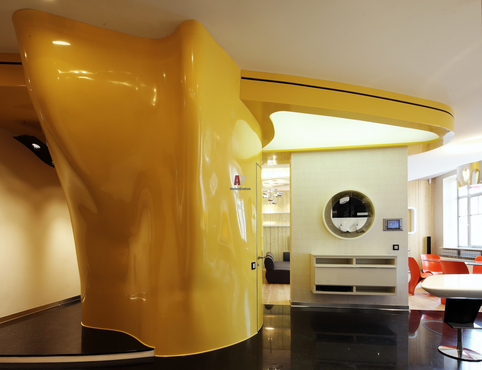 Входная группа обозначена пластичным объемом из кориана. Он был вдохновлен дизайном инновационной кухни по дизайну Захи Хадид для Ernestomeda.