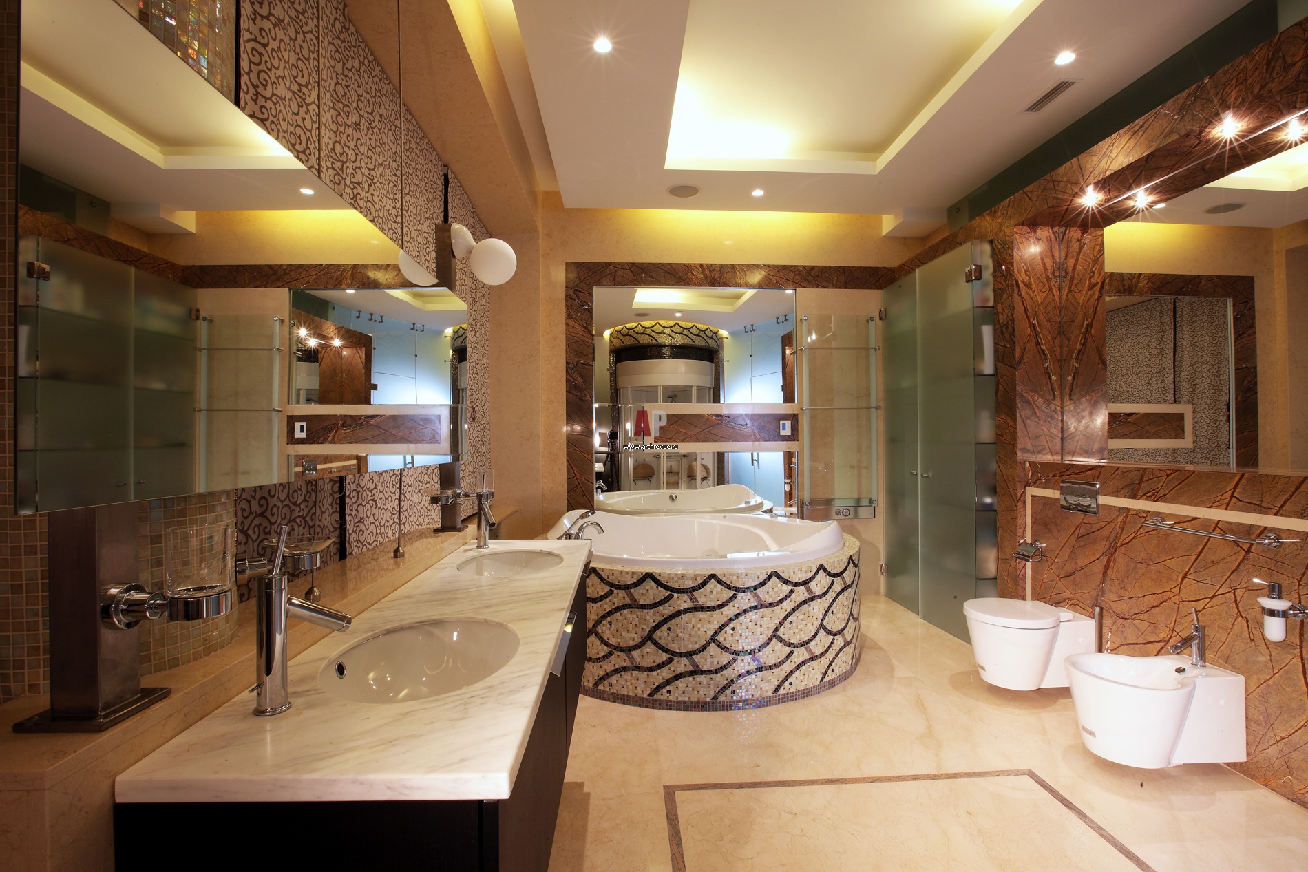 Хозяйский санузел облицован несколькими сортами мрамора природных бежево-коричневых оттенков. Полукруглая ванна украшена мозаикой Sicis.