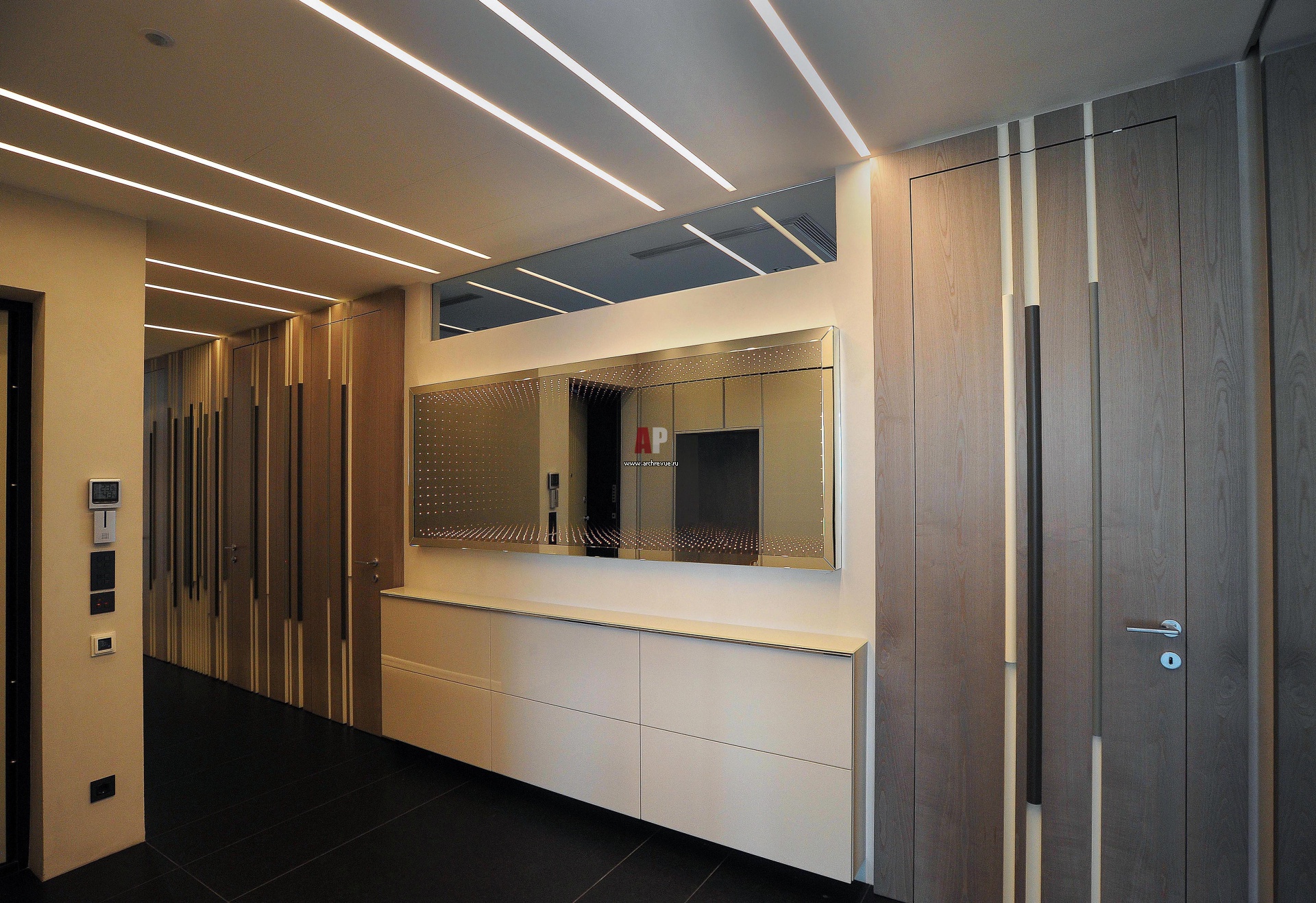 Интерьер прихожей. Двери интегрированы в стеновые панели Laura Meroni с вертикальными вставками. Тонкие потолочные светильники вносят динамику. Консоль, шкафы, Schonbuch.