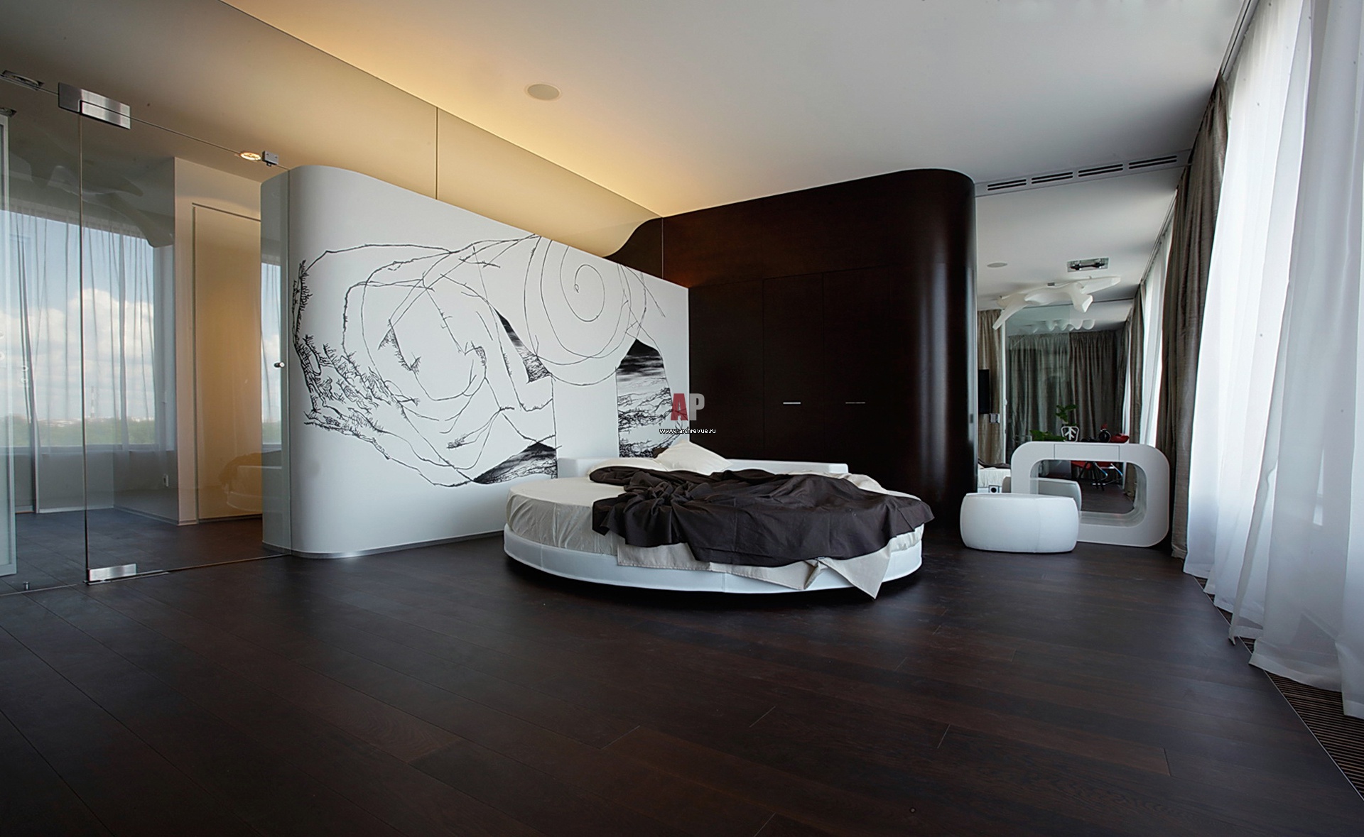 Спальня в современном стиле. Круглая кровать, Vitra. Обтекаемая перегородка за изголовьем кровати зашита деревом, перпендикулярная ей перегородка – украшена абстрактным рисунком. Туалетный столик из белого лака сделан по эскизам архитекторов.