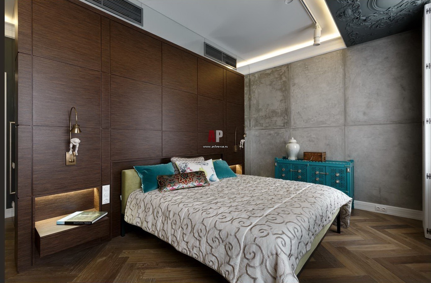 Интерьер спальни. Стена за изголовьем кровати зашита панелями из зебрано. Остальные стены оформлены панно из фибробетона с отделкой под бетон. Кровать, Falma. Светильники, Sigma L2.