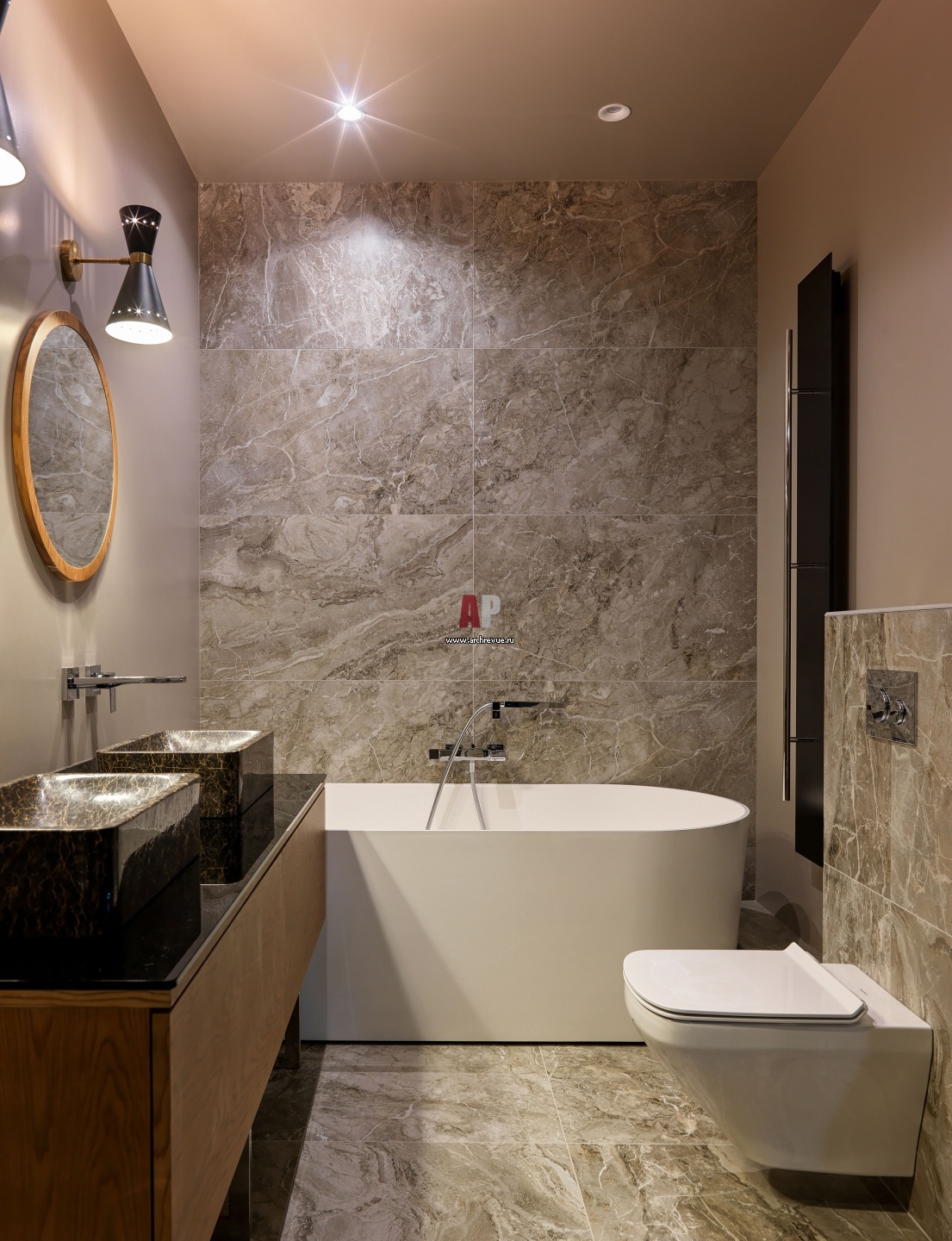 Хозяйская ванная комната. Стены, пол керамогранит с фактурой мрамора, Casalgrande Padana, коллекция Marmoker, Jolie. Ванна, Atlanta. Унитаз, Duravit.