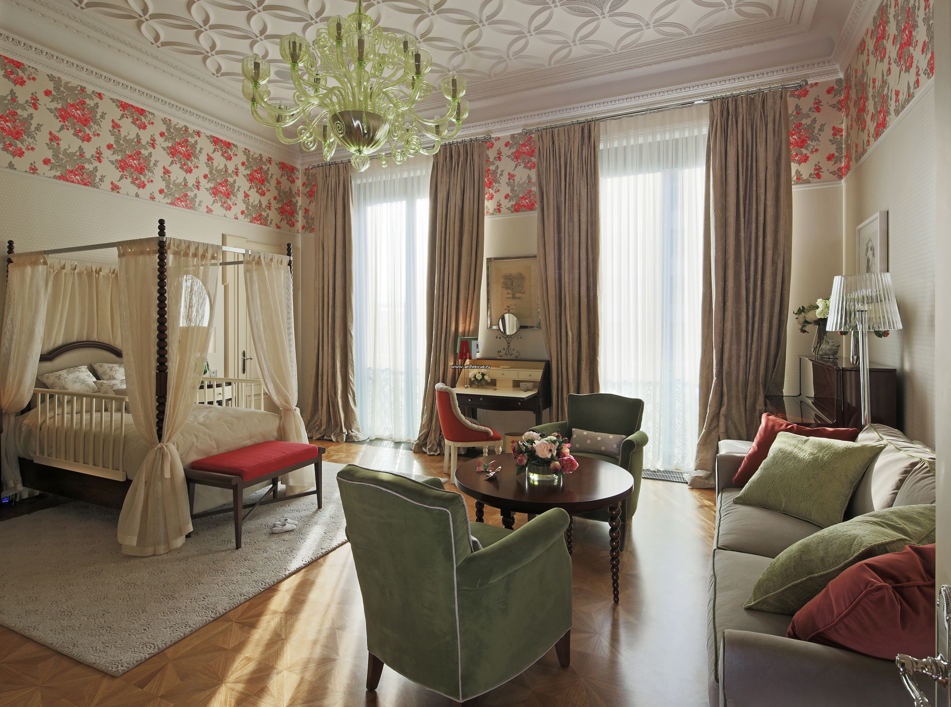 Стены детской комнаты по периметру оформлены широким кантом из обоев. Красные цветы в сочетании с нейтральными бежевыми заливками выглядят очень эффектно.