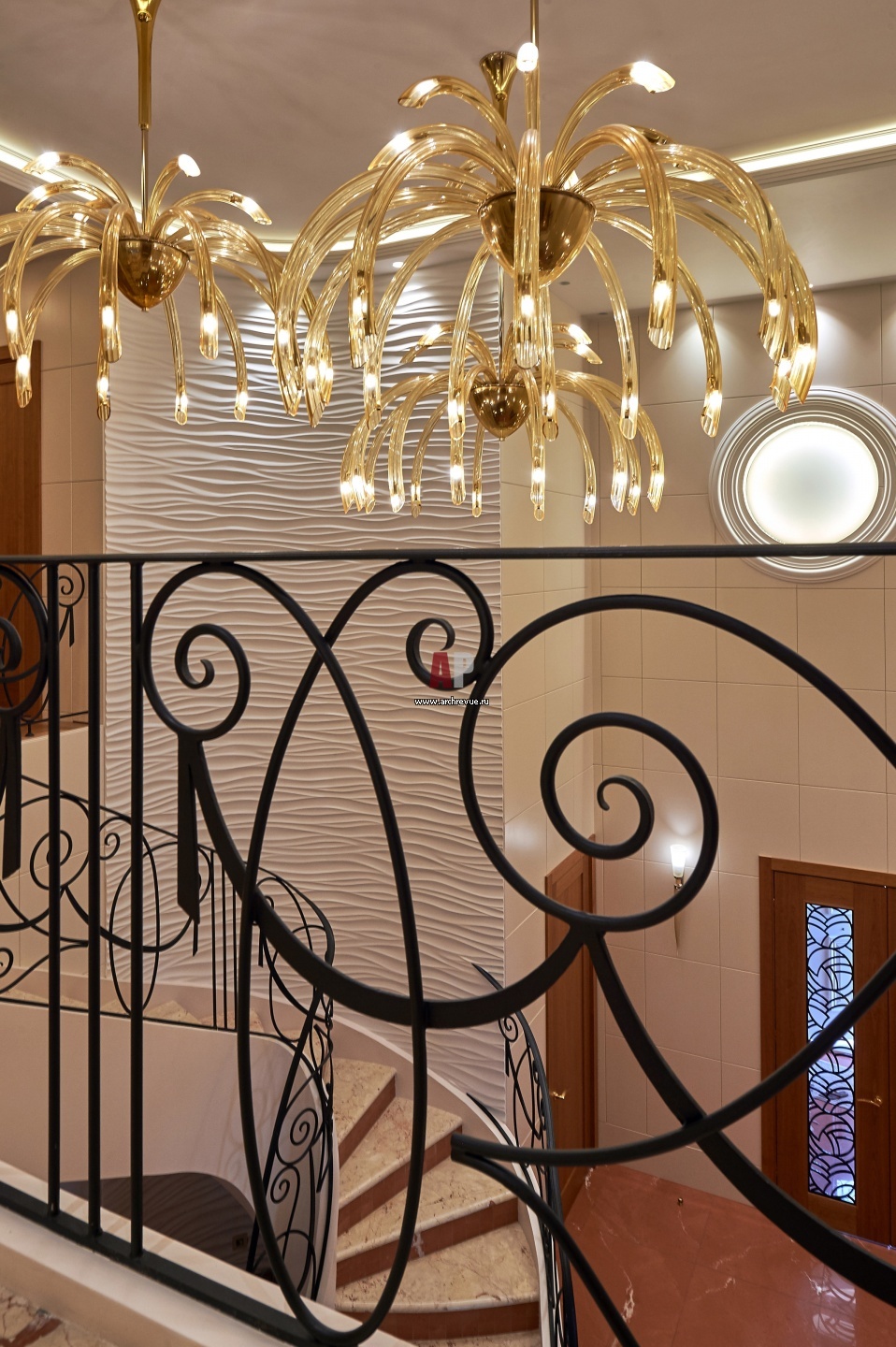 Вид с галереи второго этажа через кованое ажурное ограждение на общую зону. Высоту подчеркивает оформление колонны и стены лестничного холла волнообразным лепным декором из гипса.