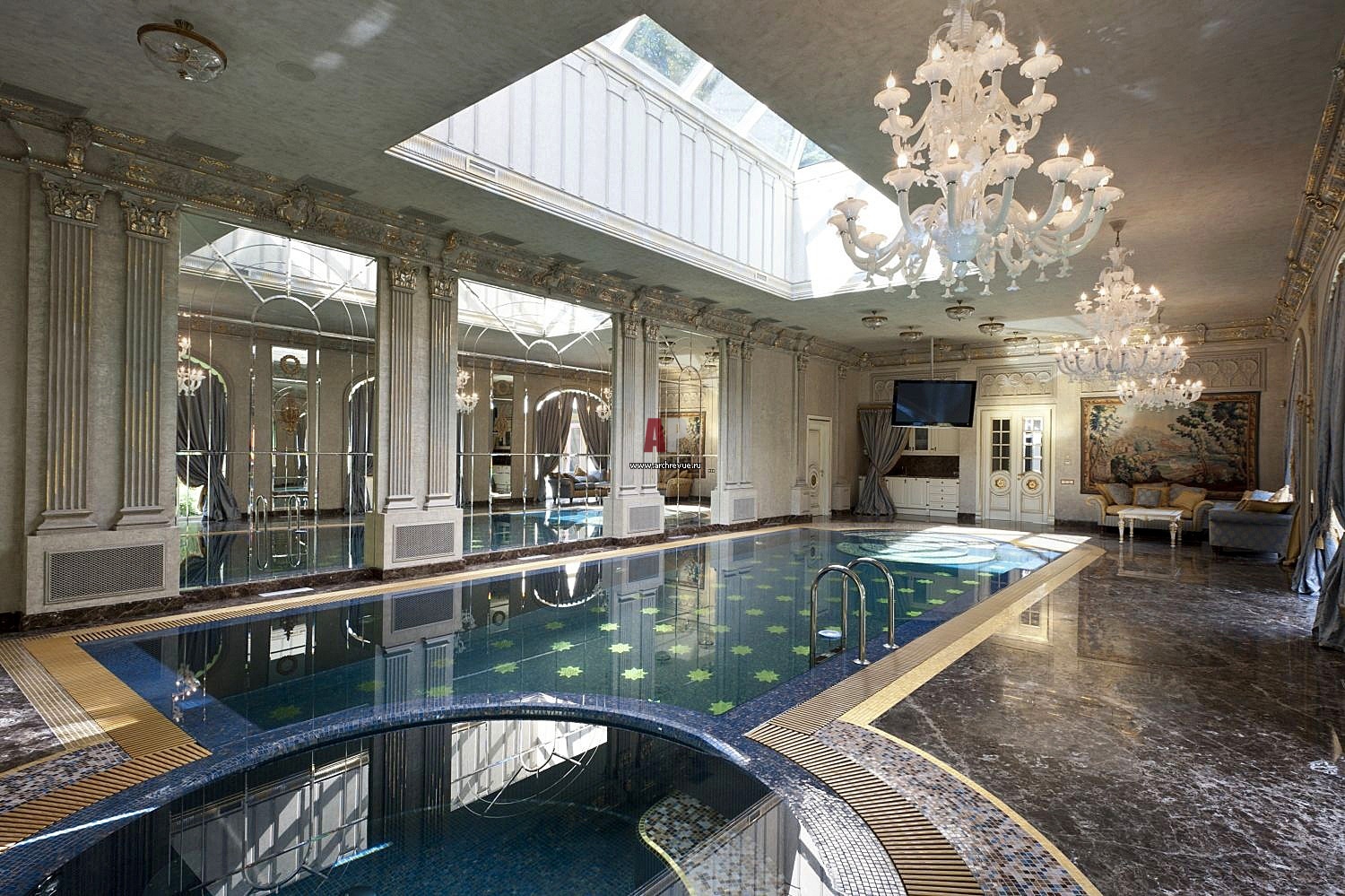 Бассейн расположен в отдельном павильоне со стеклянным куполом, он оформлен в венецианском стиле. Одна из стен отделана фацетированными зеркалами, остальные стены оформлены финишами под старину.