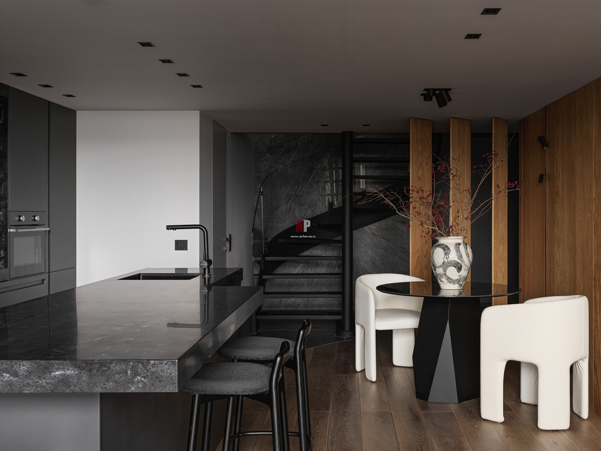 Зона столовая. Проходное пространство очень хотелось сделать эстетичным, поэтому здесь большое внимание уделено мебели плавных обтекаемых форм. От холла столовую отделяют вращающиеся панели.