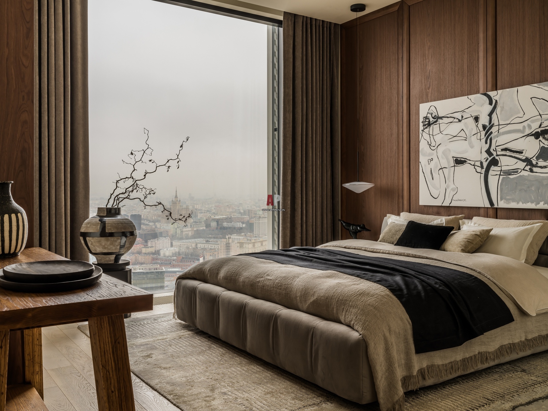 Мастер-спальня с элементами ваби-саби. Стена за изголовьем зашита шпонированными панелями с активной текстурой. Свет, Vibia.