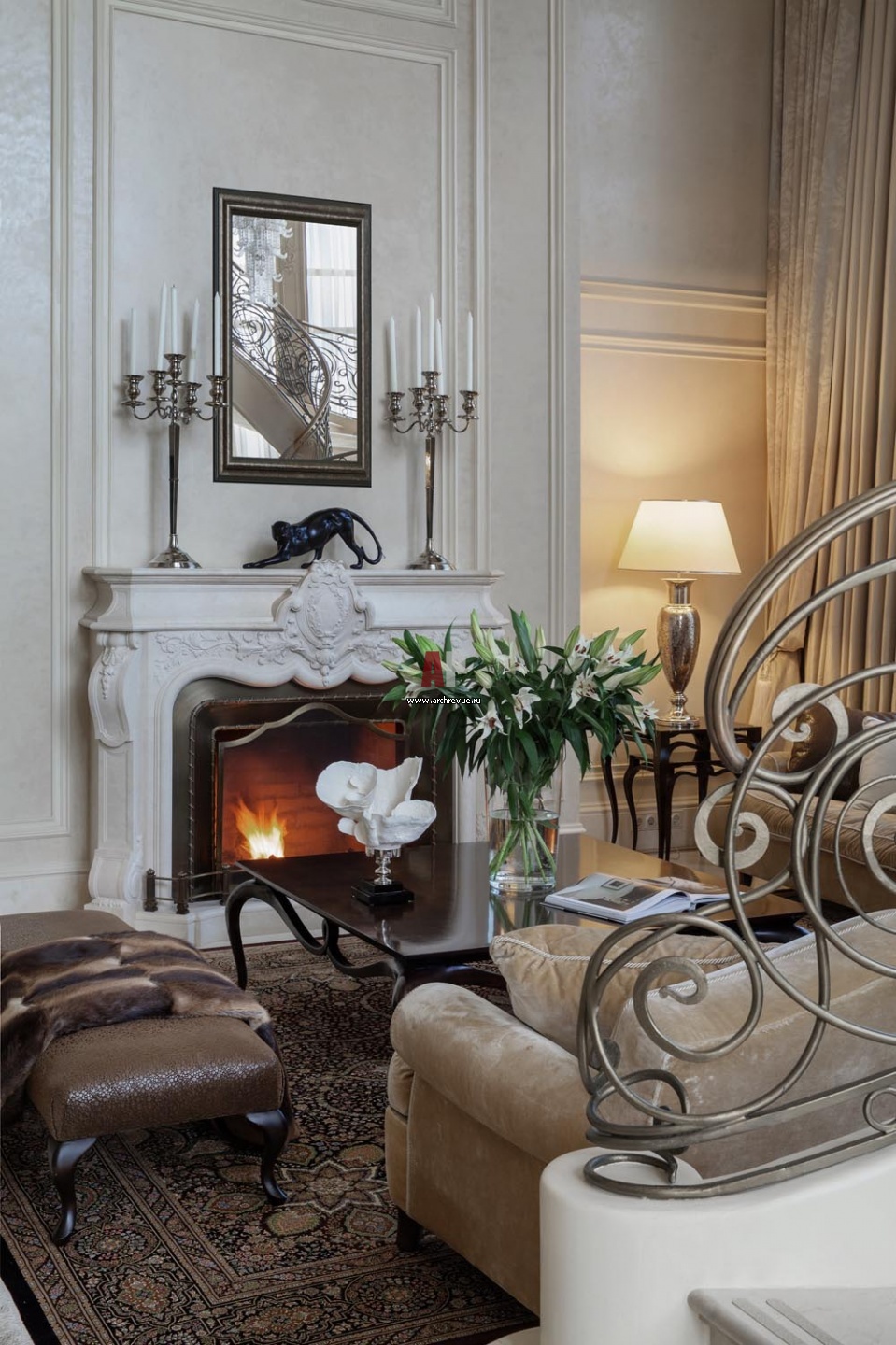 Неоклассический портал камина выполнен из мрамора с матовой и глянцевой полировкой. Латунная топка камина перекликается с лестничным ограждением ручной работы.