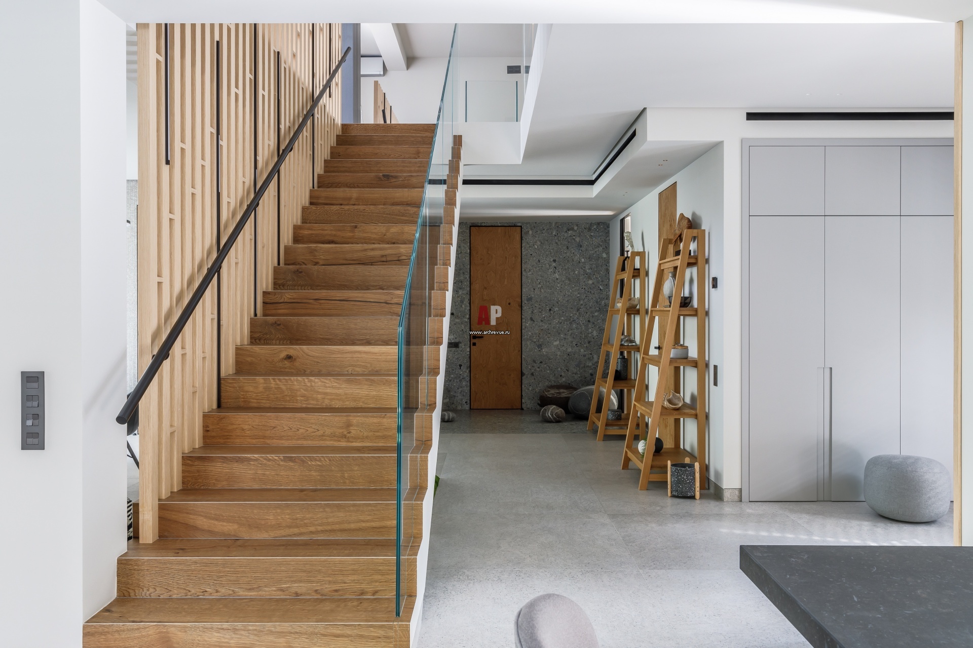 Лестница на второй этаж имеет динамичную форму. С одной стороны ограждением ей служит деревянная реечная перегородка, с другой – стекло. На ступенях – керамогранит под дерево, Porcelanosa, коллекция Delawere Nogal.