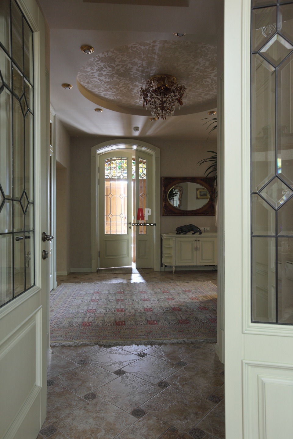 Входная зона в неоклассике. Двери украшены витражами из прозрачного стекла с фацетами. Они выполнены на заказ и отсылают к стилистике модерна.