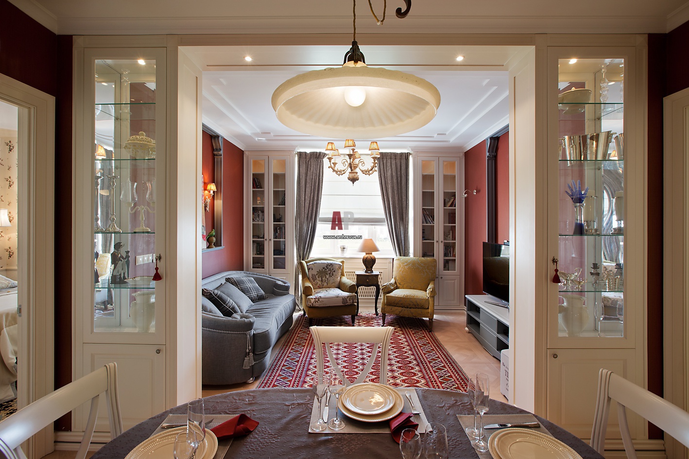 Вид со стороны столовой на гостиную. Две разные функциональные зоны условно разделены широким проемам. По обе стороны от него – высокие шкафы-витрины из крашеного в белый цвет дерева. Они выполнены на заказ по эскизу дизайнера.