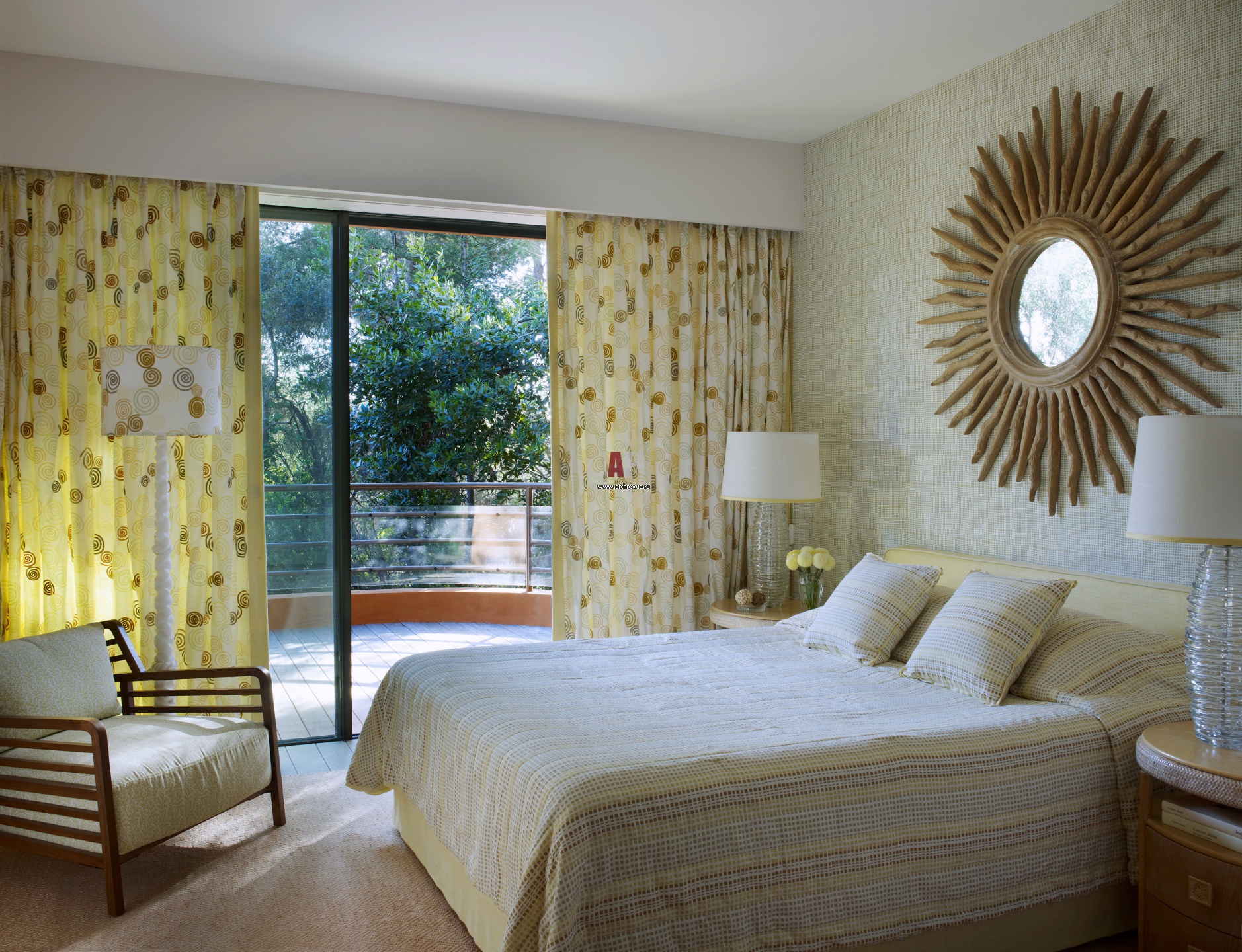 Фото спальни в интерьере виллы на побережье. Текстиль с вкраплениями солнечного, желтого цвета.