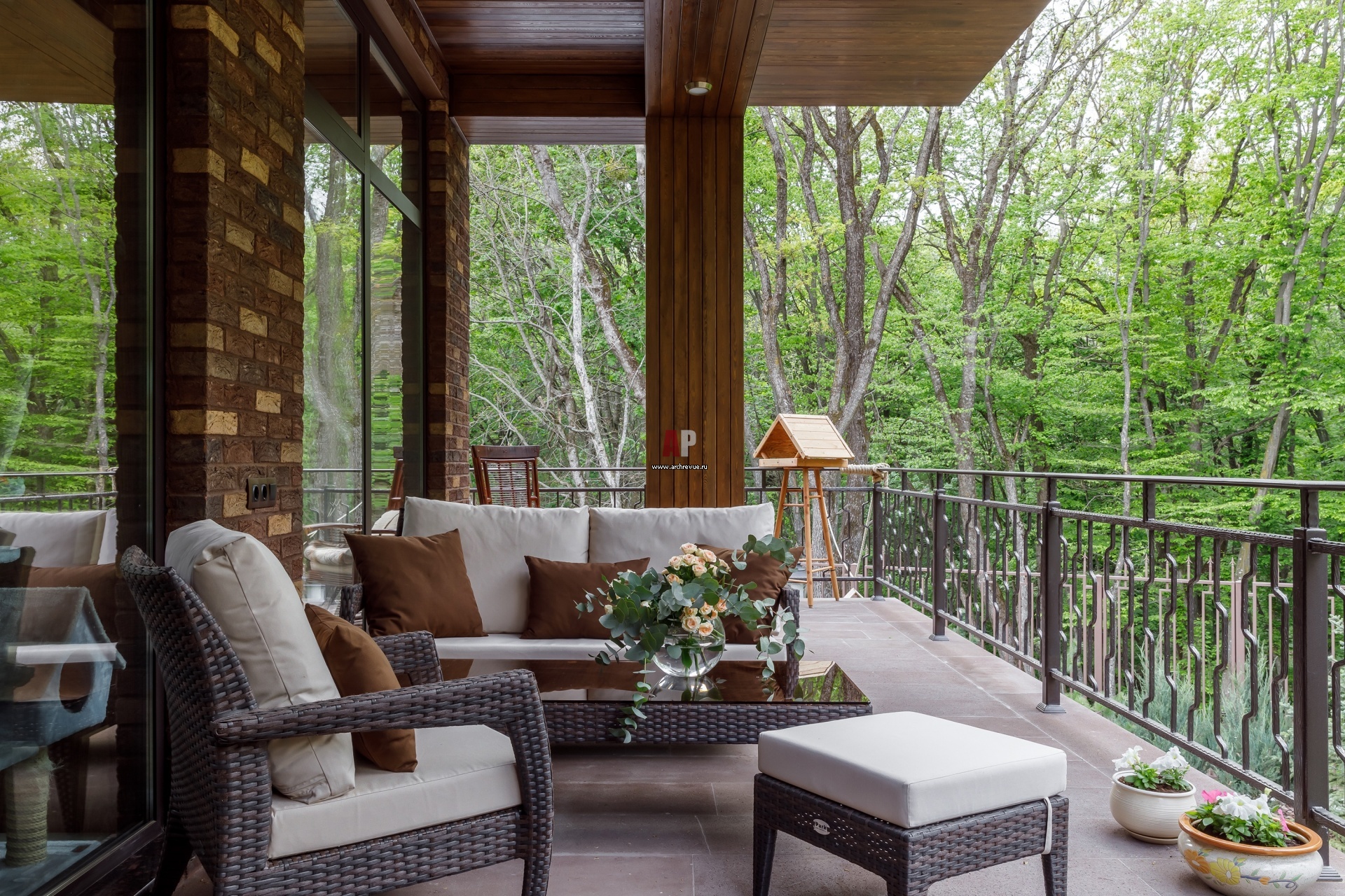 Терраса с видом на лес и уличной мебелью.