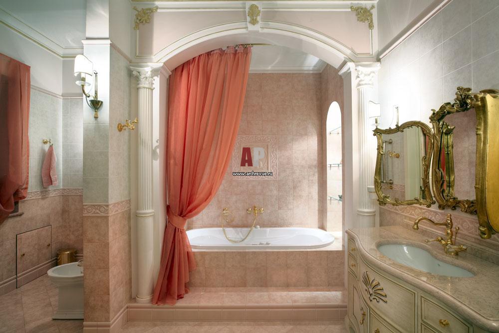 Интерьер ванной построен на сочетании двух цветов керамической плитки с использованием декоративных бордюров, художественных розеток и колон. Сама ванна расположена в нише с колонным портиком. Плитка, керамогранит Atlas Concorde, поставщик «Тоскана Дизайн». Мебель для ванной комнаты LineaTre, поставщик «Танит».