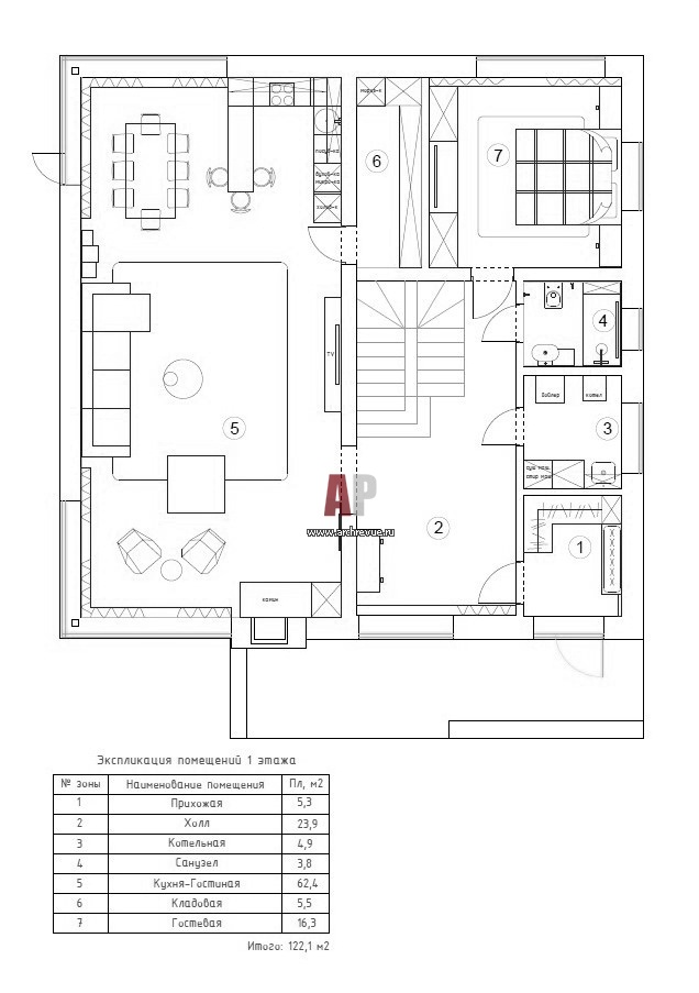 План первого этажа двухэтажного современного дома семьи с четырьмя детьми. Общая площадь – 250 кв. м.