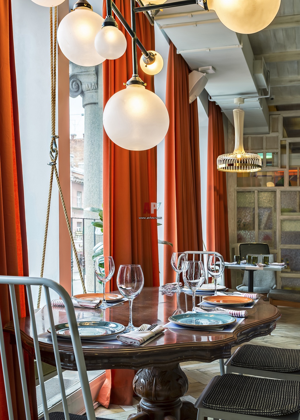 Фото интерьера зала ресторана в стиле фьюжн с элементами китча.