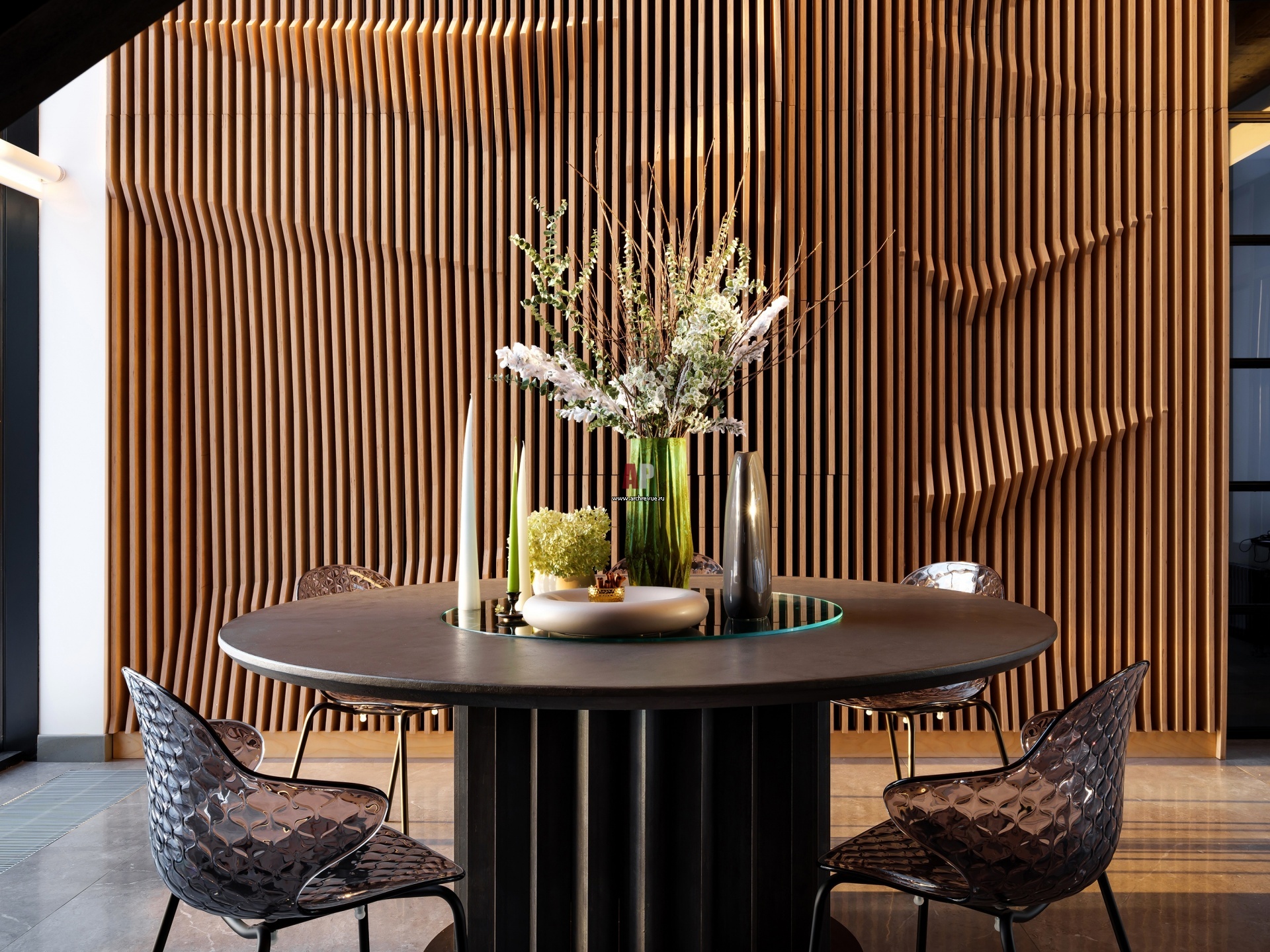 Обеденный стол разработал автором проекта. Его основание состоит из стальных уголков, сваренных между собой по кругу и покрытых прозрачным лаком. Столешница выполнена в виде диска из фанеры с финишем из микробетона и прозрачным стеклом по центру.