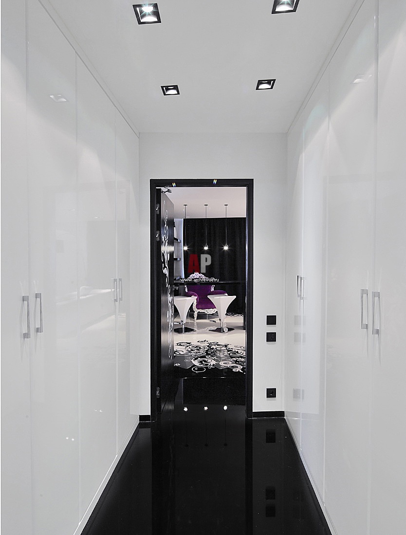 Вид со стороны гардеробной на общественную часть. Гардеробная имеет три выхода: в гостиную, спальню, хозяйский санузел. Встроенные шкафы, белый глянец.
