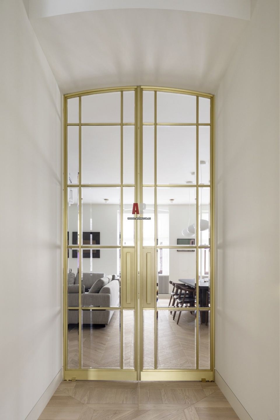 Холл. Двустворчатая арочная стеклянная дверь в латунном профиле сделана на заказ. Дверная и мебельная фурнитура Buster + Punch.