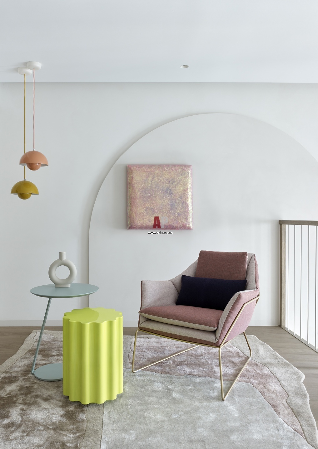 Обе детские получились двухуровневыми. Интерьер одной из детских с зоной отдыха на антресоли. Кресло, Saba Italia. Подвесной светильник, &Tradition.