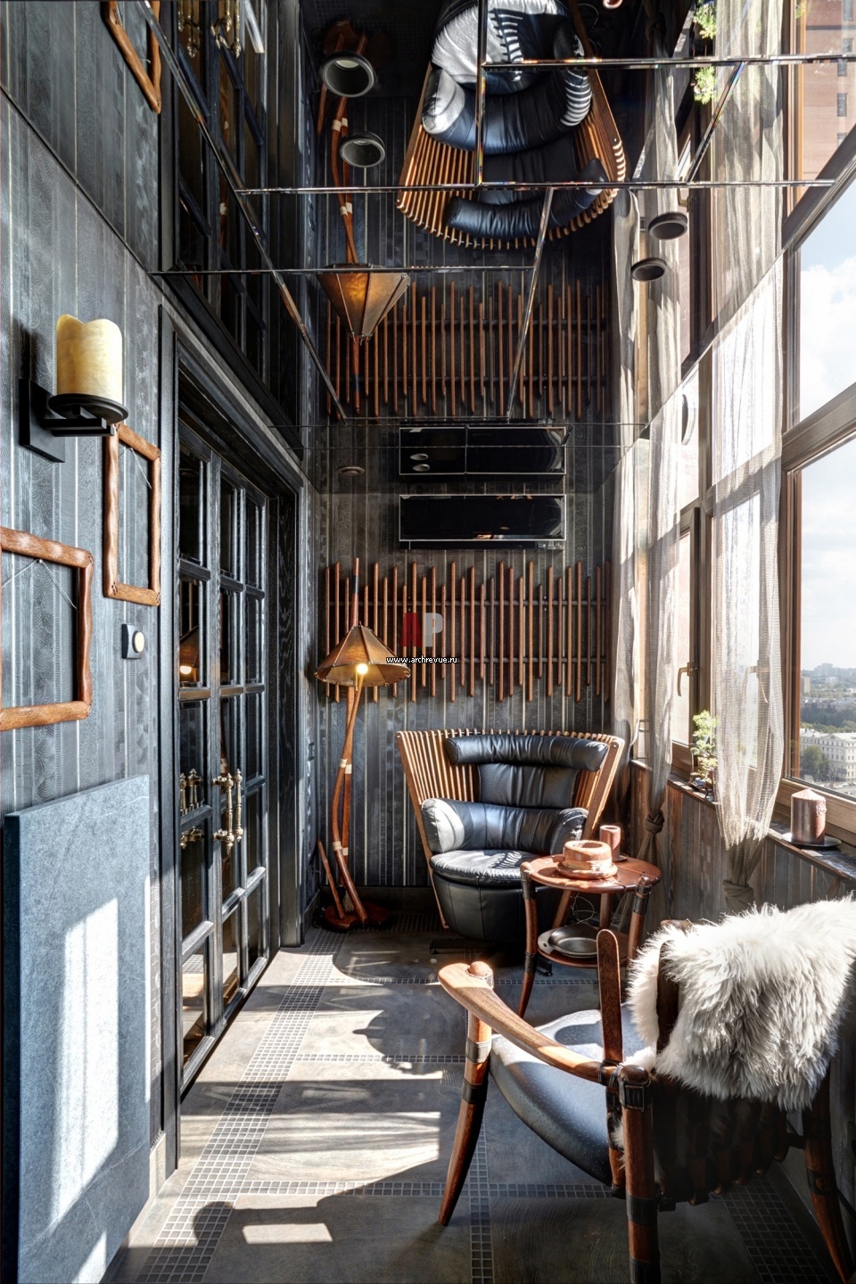 Лоджия меблирована австралийской уличной мебелью, которая была куплена до начала ремонта. Стены оформлены декоративными финишами, имитирующими ткань с узором.