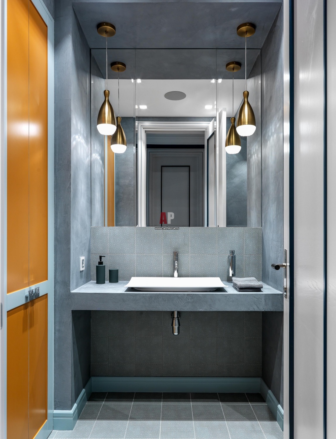 Цвет стен гостевого санузла – серый. Отделка – микроцемент. На полу – плитка Mutina светло бирюзового оттенка. Вся мебель – по эскизам дизайнера. Сантехника, Antonio Lupi. Смесители, Dornbracht.