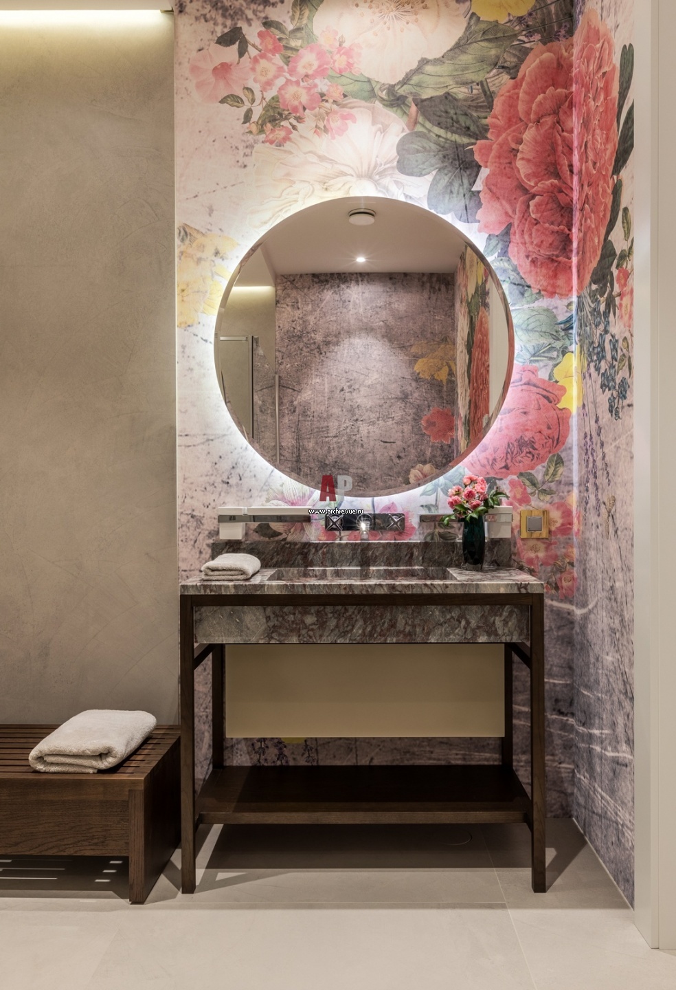 Тема санузла при гостевой спальне – растительные мотивы. Обои, Wall&Deco. Банкетка и мебель под раковину, на заказ. Столешница и раковина из мрамора Salome.