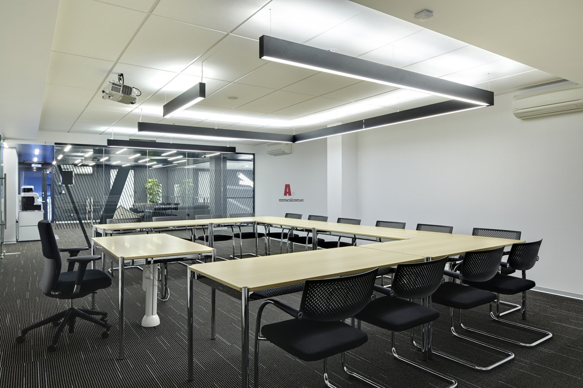 Фото интерьера обучающего помещения в центре Volkswagen. Расположение черных светильников на потолке повторяет расстановку столов.