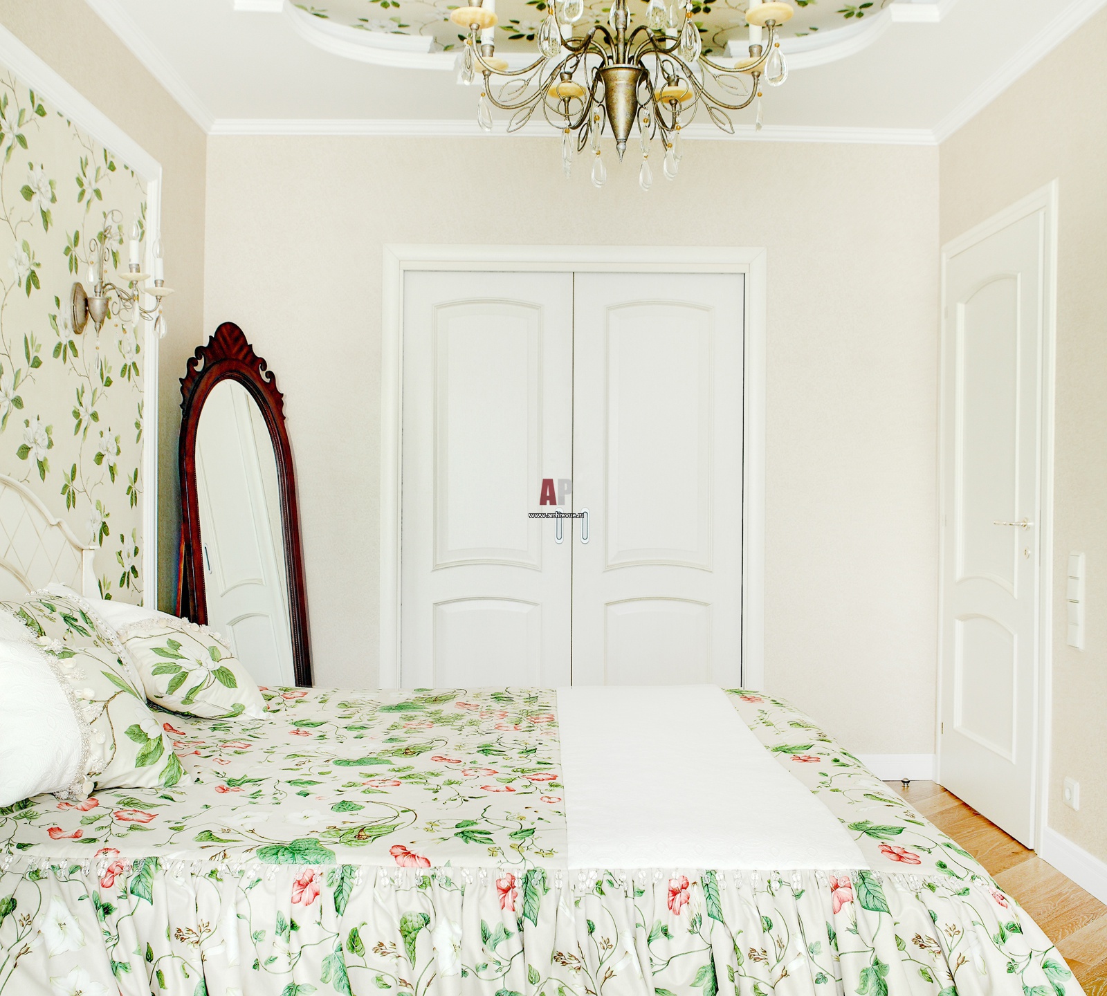 Потолок спальни декорирован теми же обоями, что и изголовье кровати. Белые с патиной двери, Union.