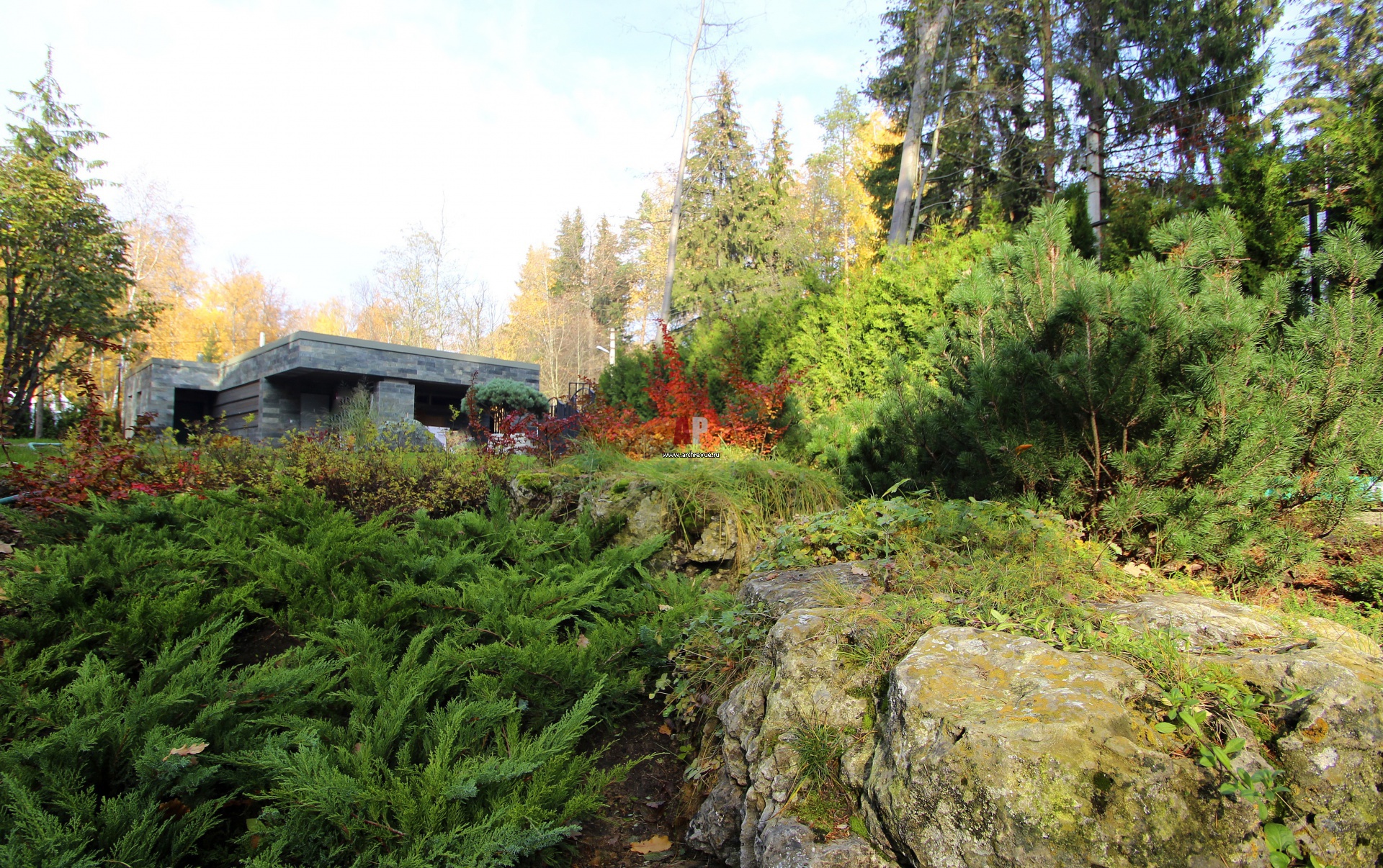 Вид на гараж. Камни из дикого, поросшего мхом известняка, сквозь который побиваются мелкие травы. На каменистом участке высажены можжевельники и горные сосны.